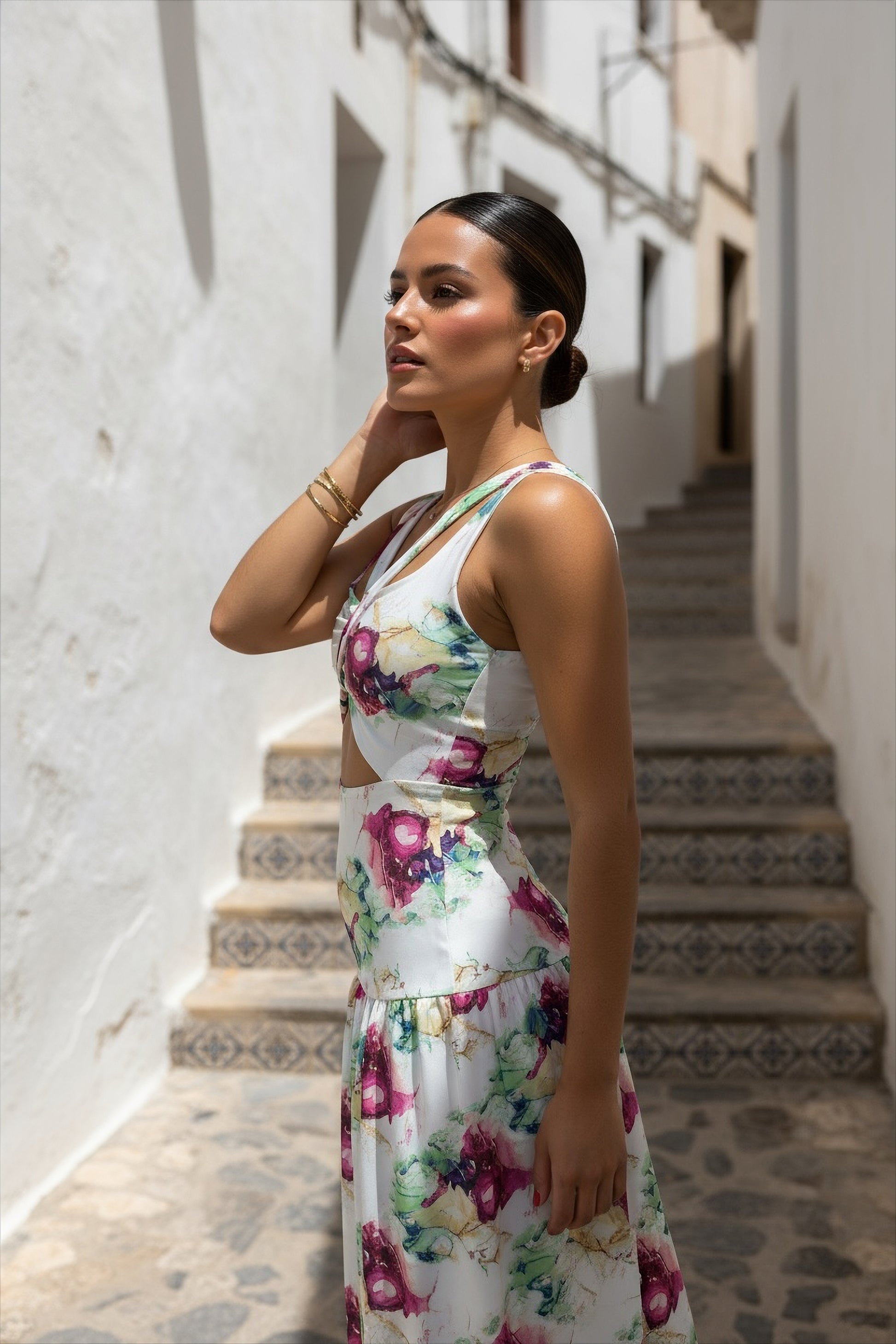 - Sleeveless silhouette with wide straps