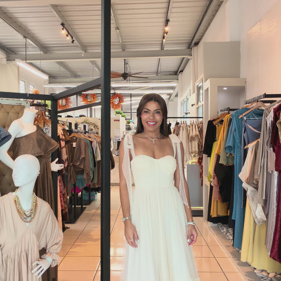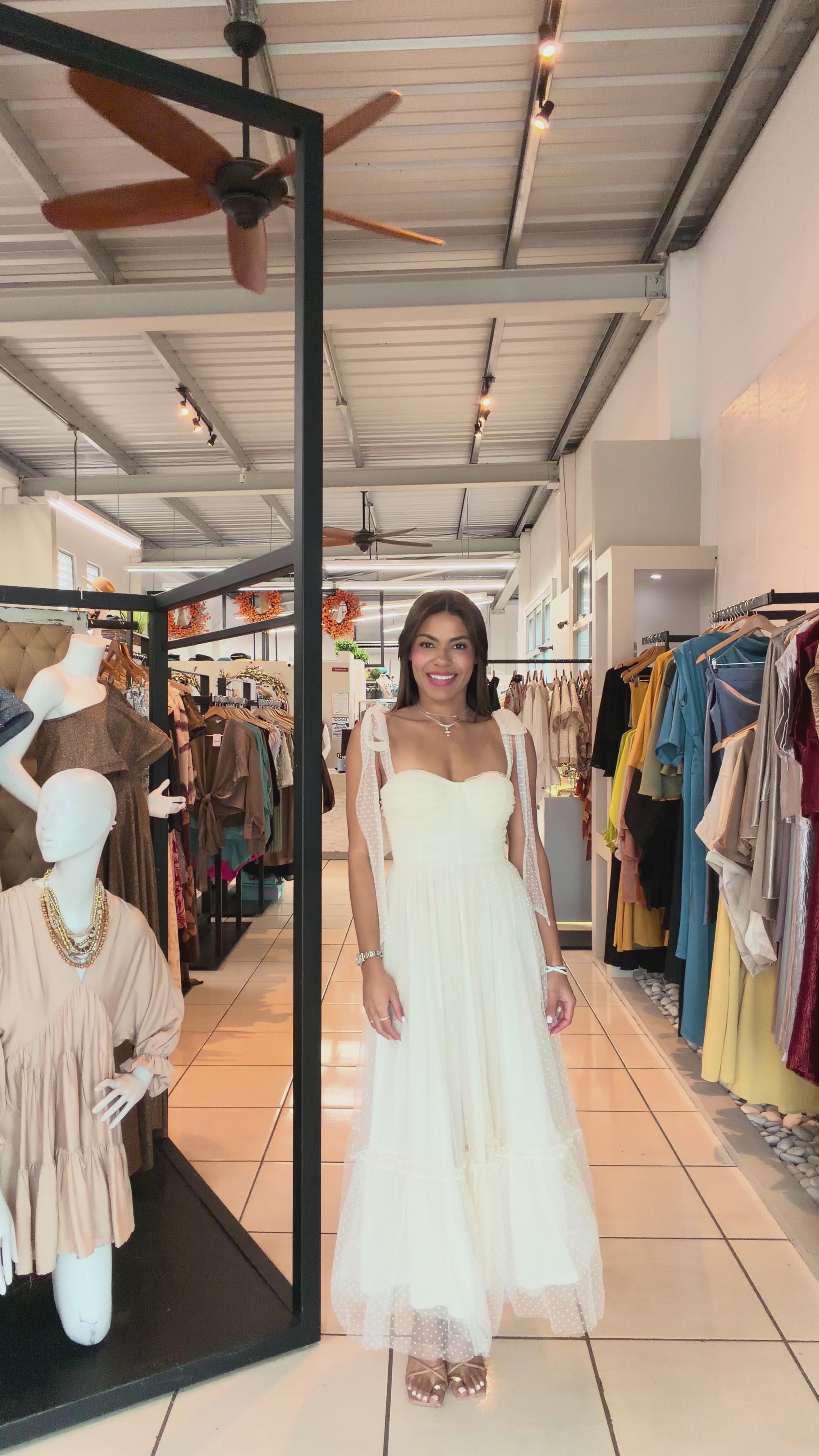 Ivory dotted tulle midi dress with soft A-line silhouette
