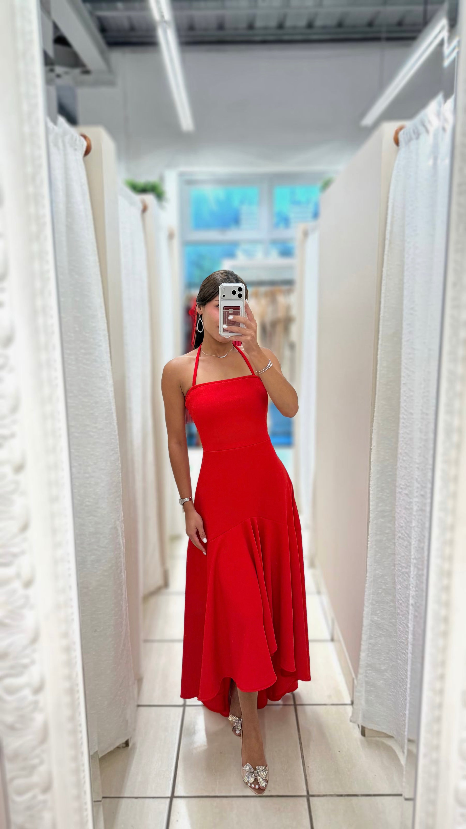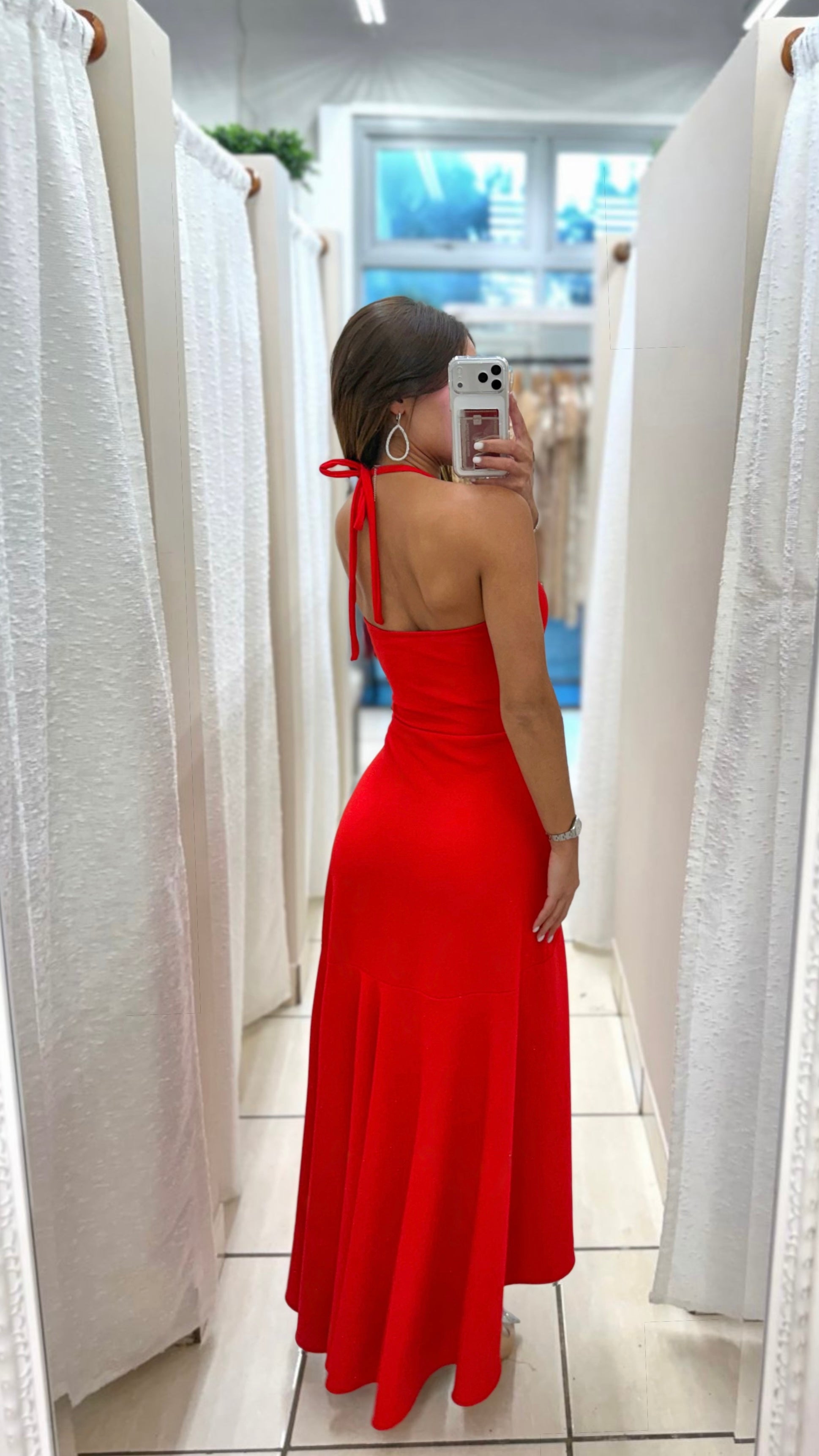Bold red halter midi dress with fluid movement