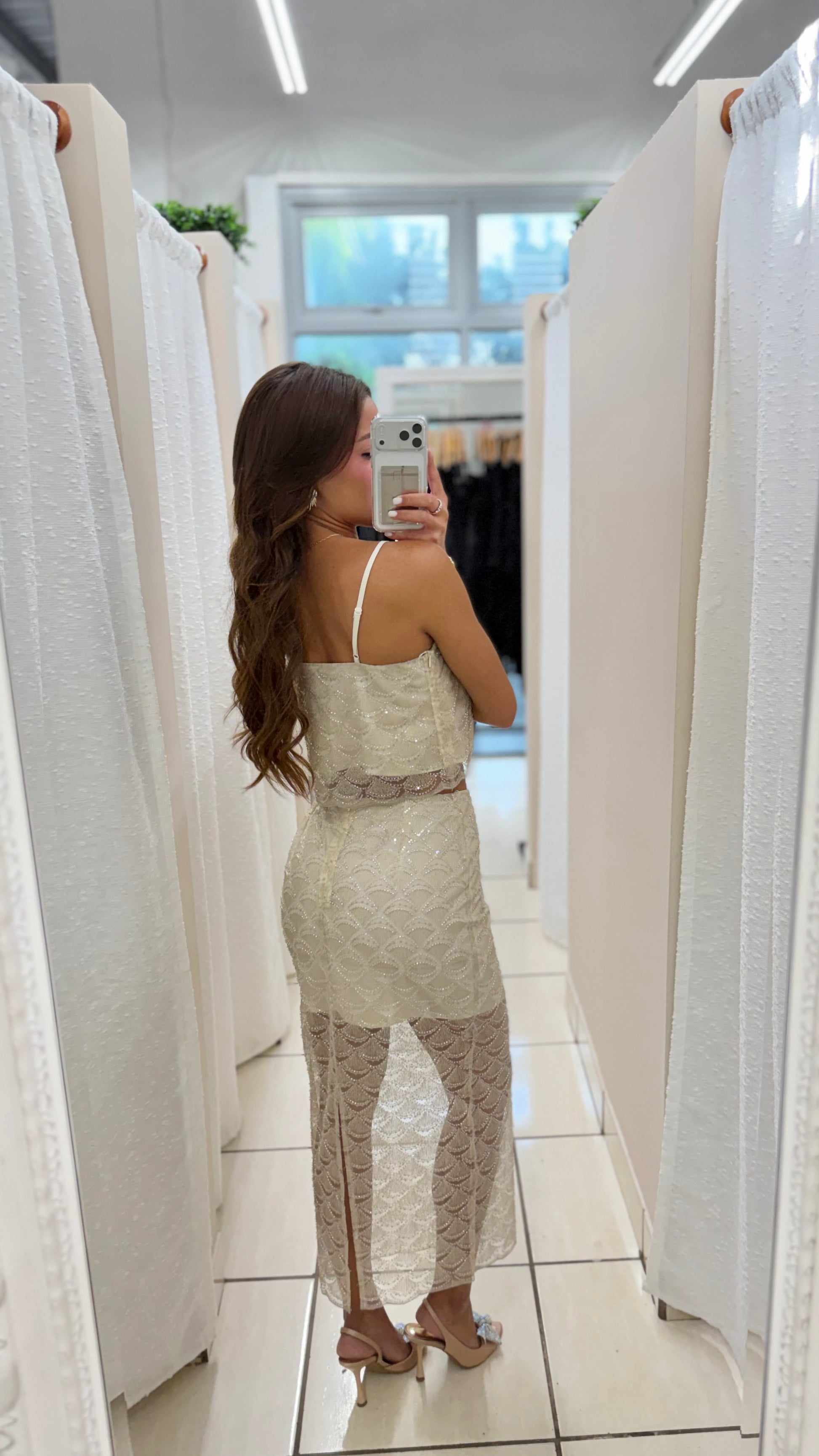 Two-piece ensemble in shimmering ivory lace with scalloped beading