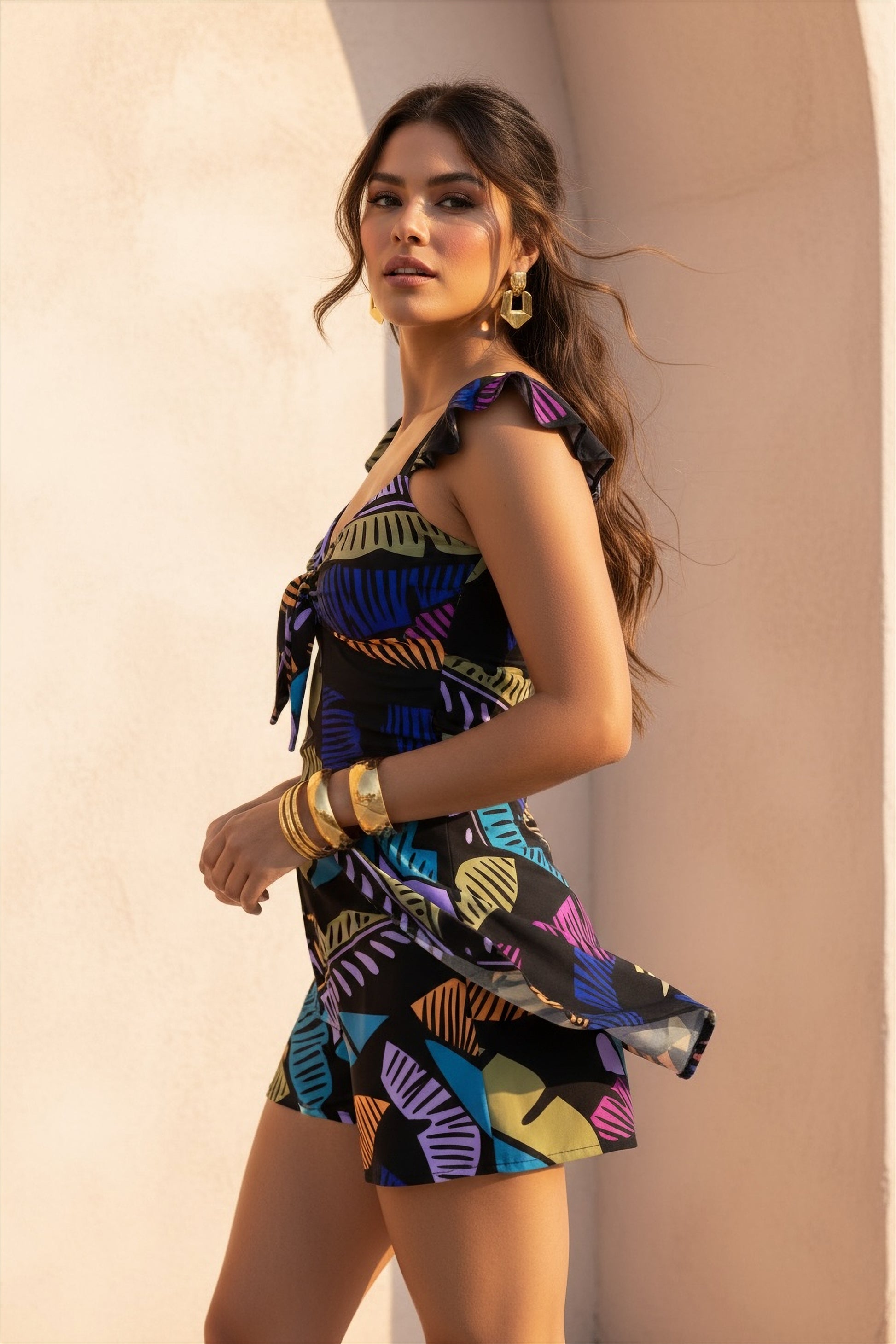 - Model measurements: Bust 34” / Waist 26” / Hips 39” / Height 5’7”. Wearing small