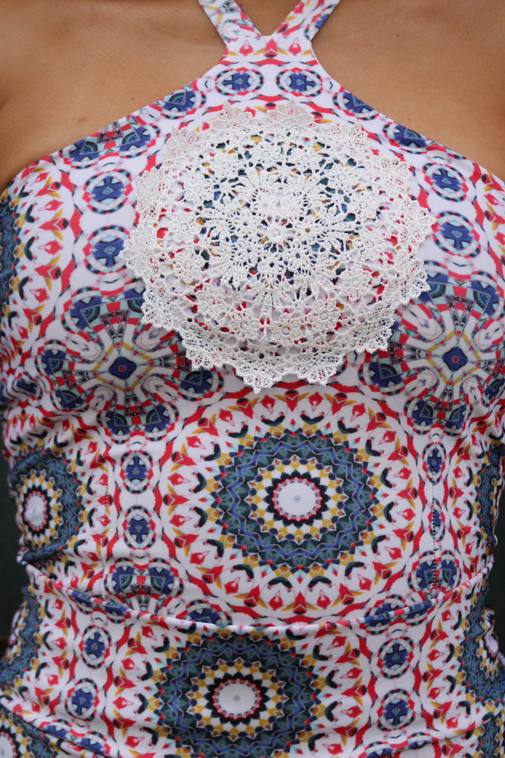 - Fabric: Geometric mandala-inspired print in vibrant tones of red, blue, and ivory