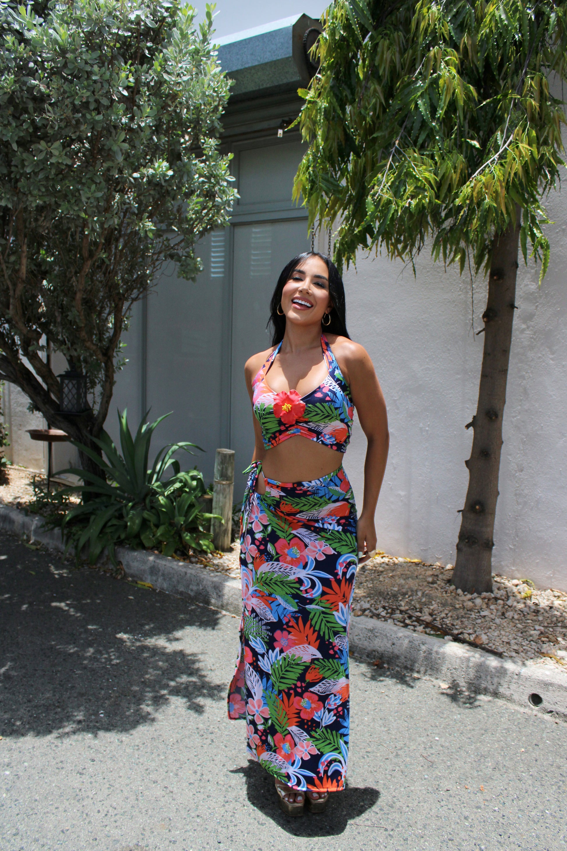Halter crop top with adjustable center drawstring and vibrant flower accent